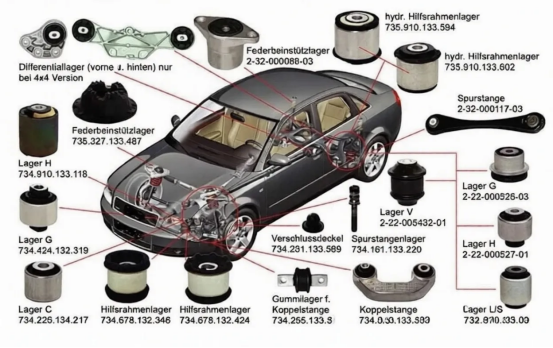 1. Systém odpruženia:V odpružení slúžia gumené puzdrá na pripojenie komponentov, tlmenie nárazov a udržiavanie presného zarovnania – čím sa zlepšuje ovládateľnosť vozidla aj jazdný komfort.